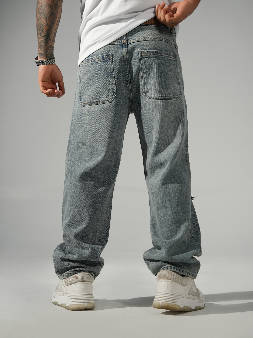 La combinación del corte amplio con los detalles rasgados crea un equilibrio visual potente. Es la máxima expresión de la comodidad sin sacrificar ni un gramo de estilo. Este jean azul te da libertad de movimiento y, al mismo tiempo, asegura que tu presencia se note en cada paso. Es la pieza central de un outfit, no un simple acompañante.