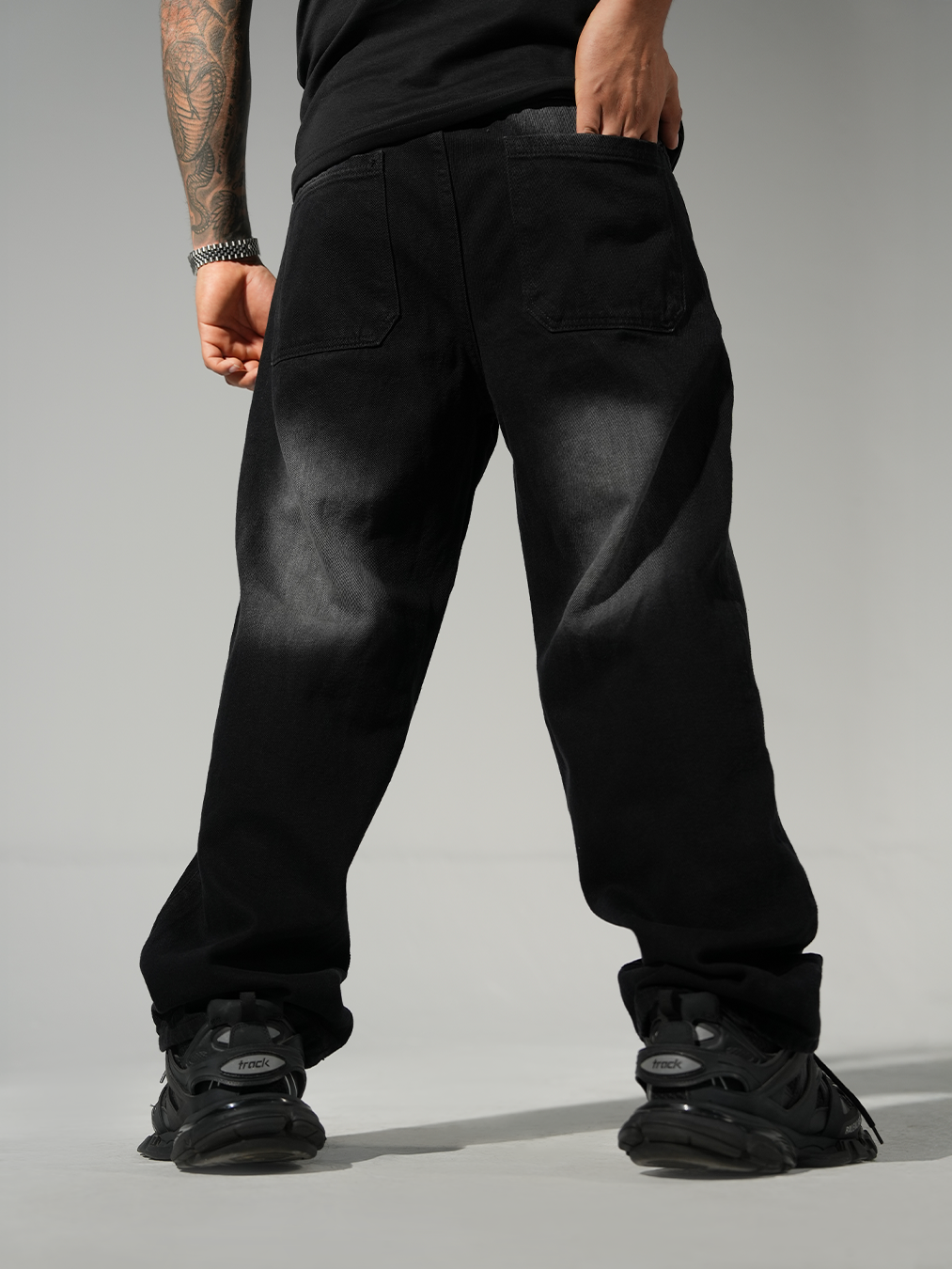 La silueta de este jean negro aprovecha el corte baggy para ofrecer una presencia imponente. Olvídate de las restricciones; aquí la prioridad es el «flow». Visualmente, el pantalón genera una estructura sólida que aterriza perfectamente sobre tus zapatillas favoritas, creando ese efecto de «apilado» o stacking que es esencial en el streetwear contemporáneo.