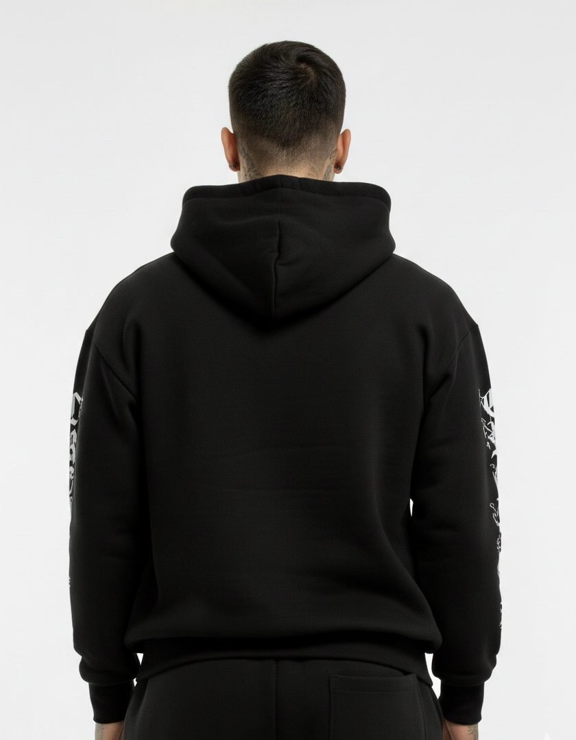 - Gráficos de Alto Impacto: Letras de estilo gótico en pecho y mangas que garantizan que no pases desapercibido, creando una estética potente y memorable.
