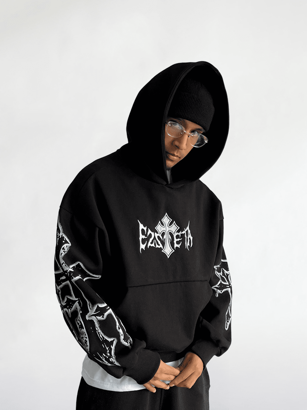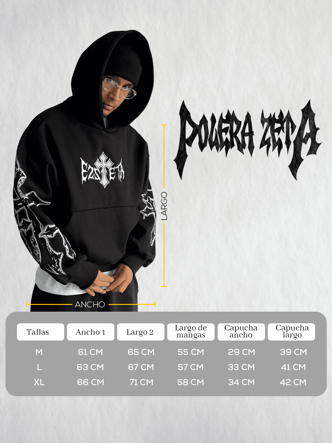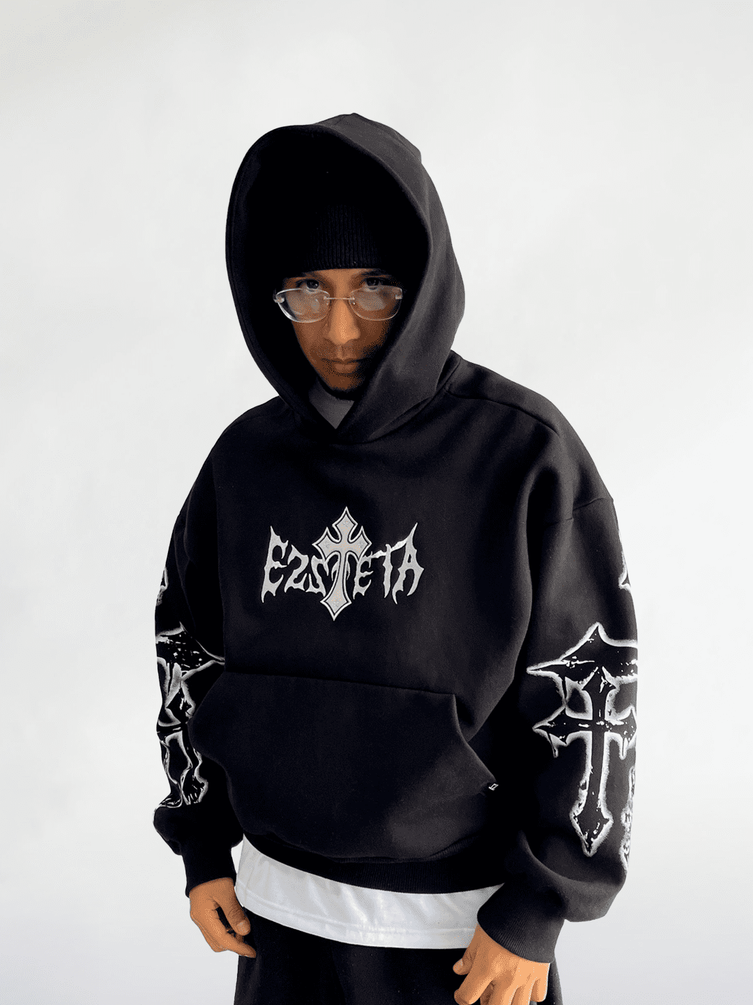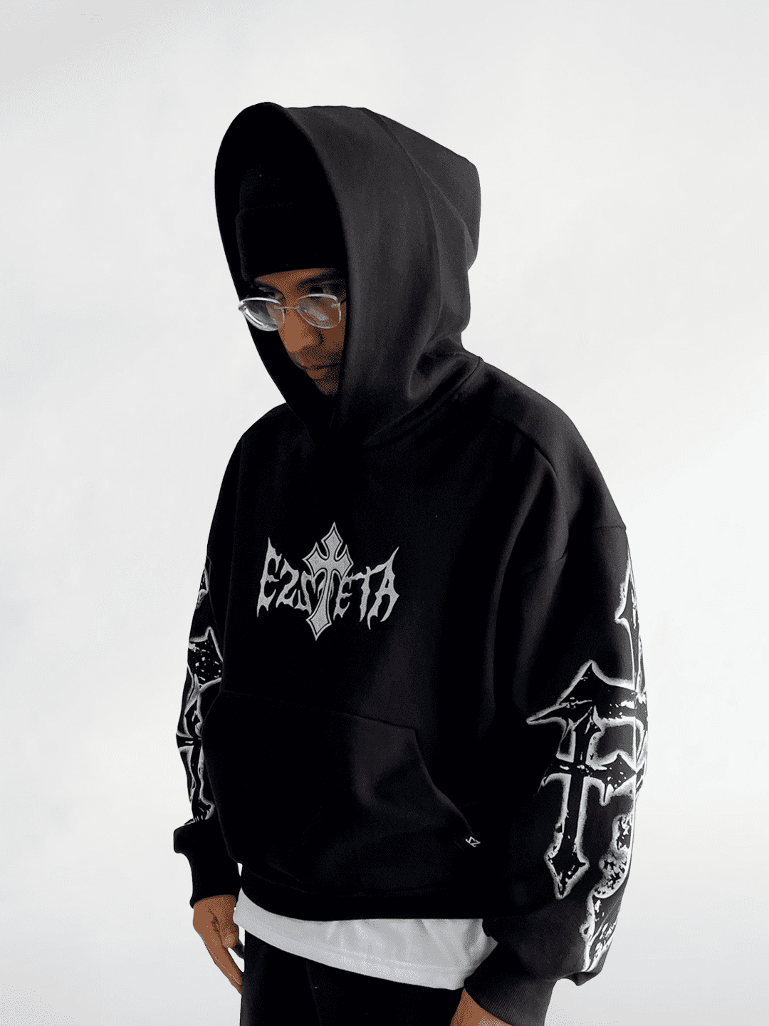 El diseño de la Polera Zeta es un lenguaje en sí mismo. En el pecho, el icónico logo de «Ezzeta» se presenta con una tipografía gótica modernizada, un sello inconfundible que evoca fuerza y misterio. Pero la verdadera narrativa se despliega en las mangas, donde gráficos de cruces estilizadas con un efecto desgastado y una textura única capturan todas las miradas. No son simples adornos; son emblemas de un espíritu rebelde y resiliente. Este balance perfecto entre el minimalismo del color negro profundo y la complejidad del arte gráfico crea una tensión visual que es a la vez agresiva y sofisticada. El corte es deliberadamente oversize, respetando las siluetas que dominan el streetwear global y garantizando no solo un estilo impecable, sino también una libertad de movimiento absoluta, ideal para el ritmo de vida dinámico y sin ataduras.