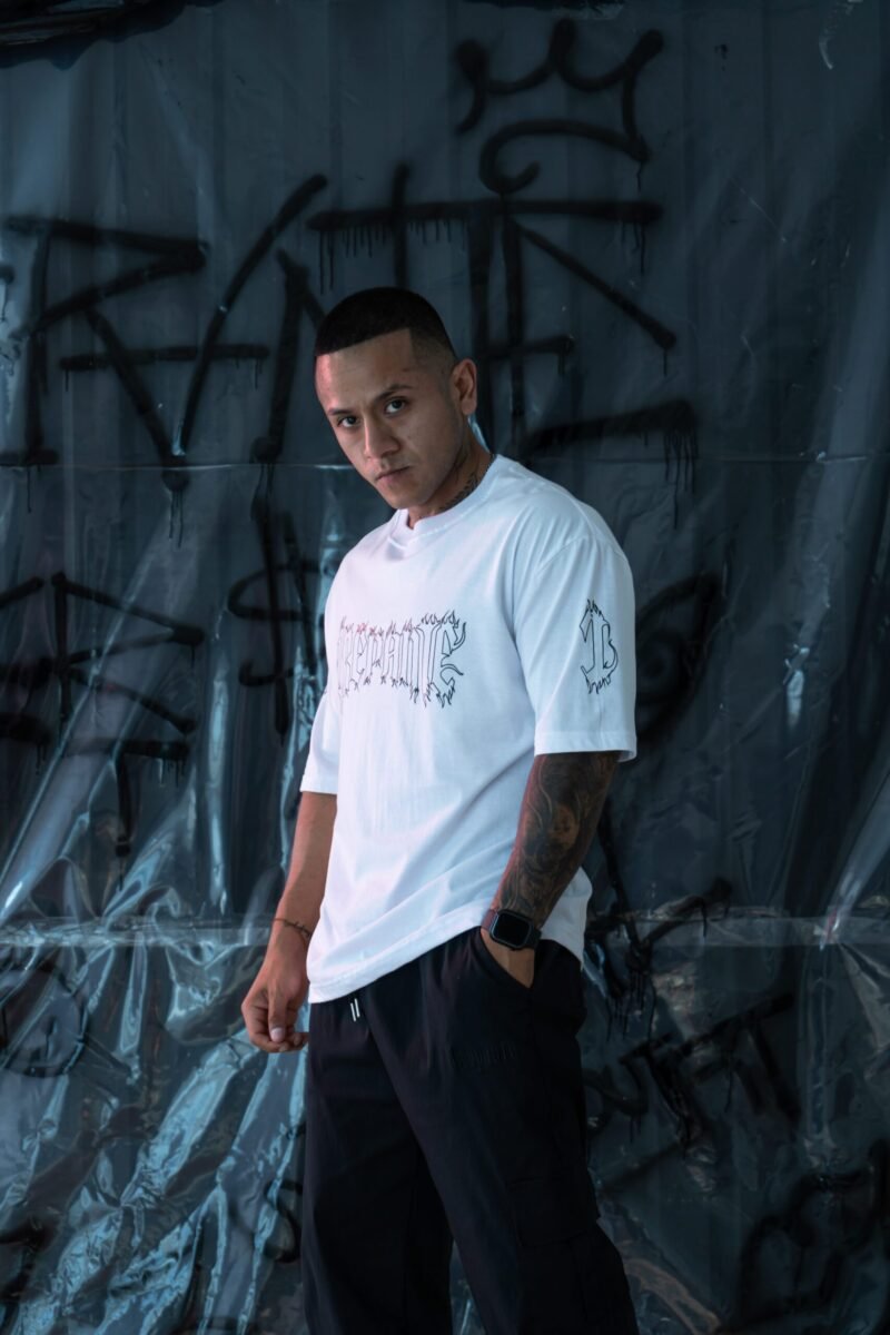 El corazón de esta prenda es su tipografía. Bautizada como «Crepante», esta gráfica es una explosión de energía contenida. Sus líneas, que recuerdan a llamas negras o trazos góticos modernos, se extienden por el pecho y marcan las mangas con una simetría agresiva. No es solo un logo, es un símbolo. Representa una actitud rupturista, una forma de ver el mundo que valora la fuerza en su estado más puro. Sobre el nítido polo blanco para hombre, el contraste del negro profundo crea un impacto visual inmediato, magnético e inconfundible. Es la firma de quienes lideran la evolución del estilo urbano en Lima y más allá.