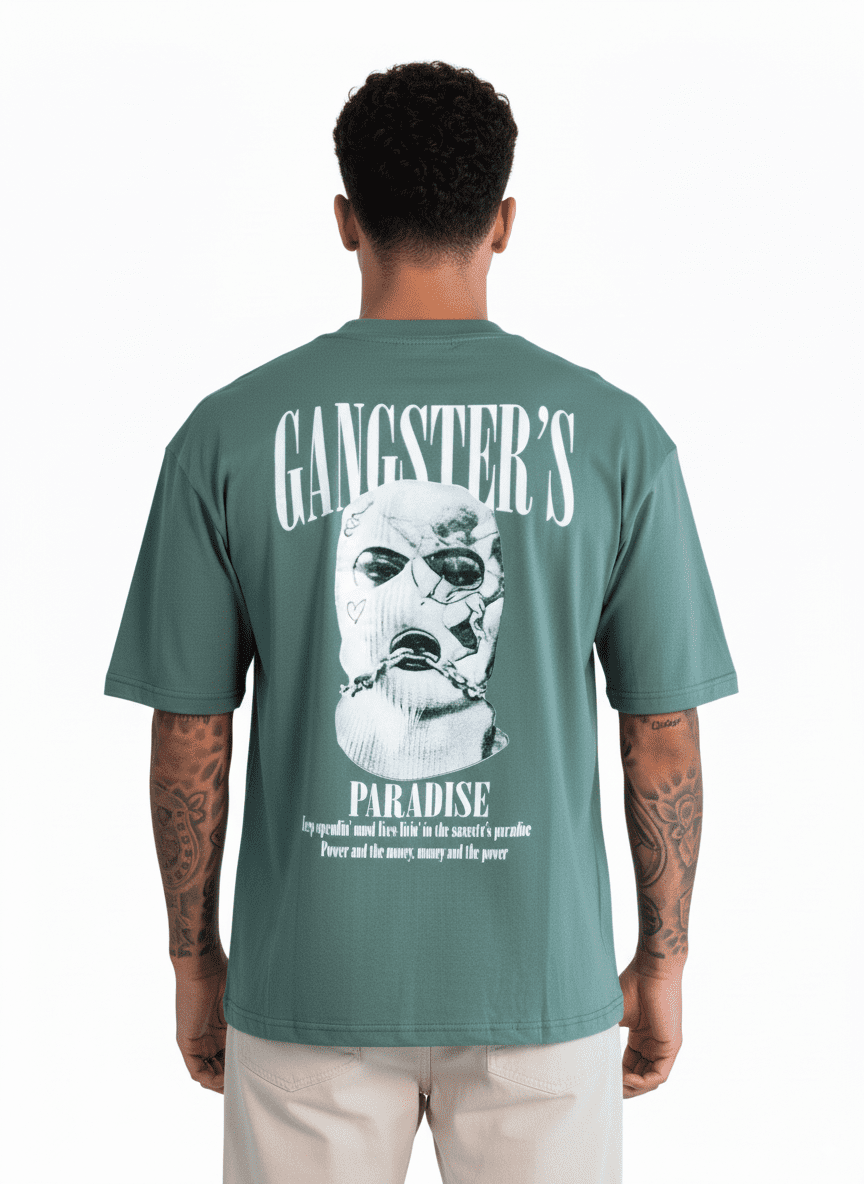 Lo que verdaderamente eleva al Polo Cemento Gángster a otro nivel es su diseño gráfico. En el pecho, un discreto pero potente logo «Gángster’s» sirve como una declaración de principios. Sin embargo, es en la espalda donde la magia ocurre. La impactante gráfica «GANGSTER’S PARADISE» presenta una estética que fusiona el arte callejero con un toque de rebeldía sofisticada. No se trata de glorificar un estilo de vida, sino de reclamar tu propio paraíso, de construir tus propias reglas en la jungla de asfalto. Es un símbolo para aquellos que son dueños de su destino, que lideran su propio camino con audacia y convicción.