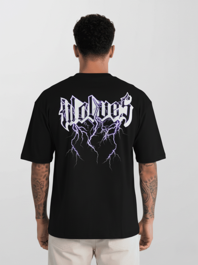 El verdadero espectáculo comienza cuando te das la vuelta. La espalda del Polo Negro Dark Thunder es una obra de arte digital llevada a la tela. El texto «Wolves» se expande en grandes dimensiones, coronando un despliegue de rayos púrpuras y blancos que descienden con furia.