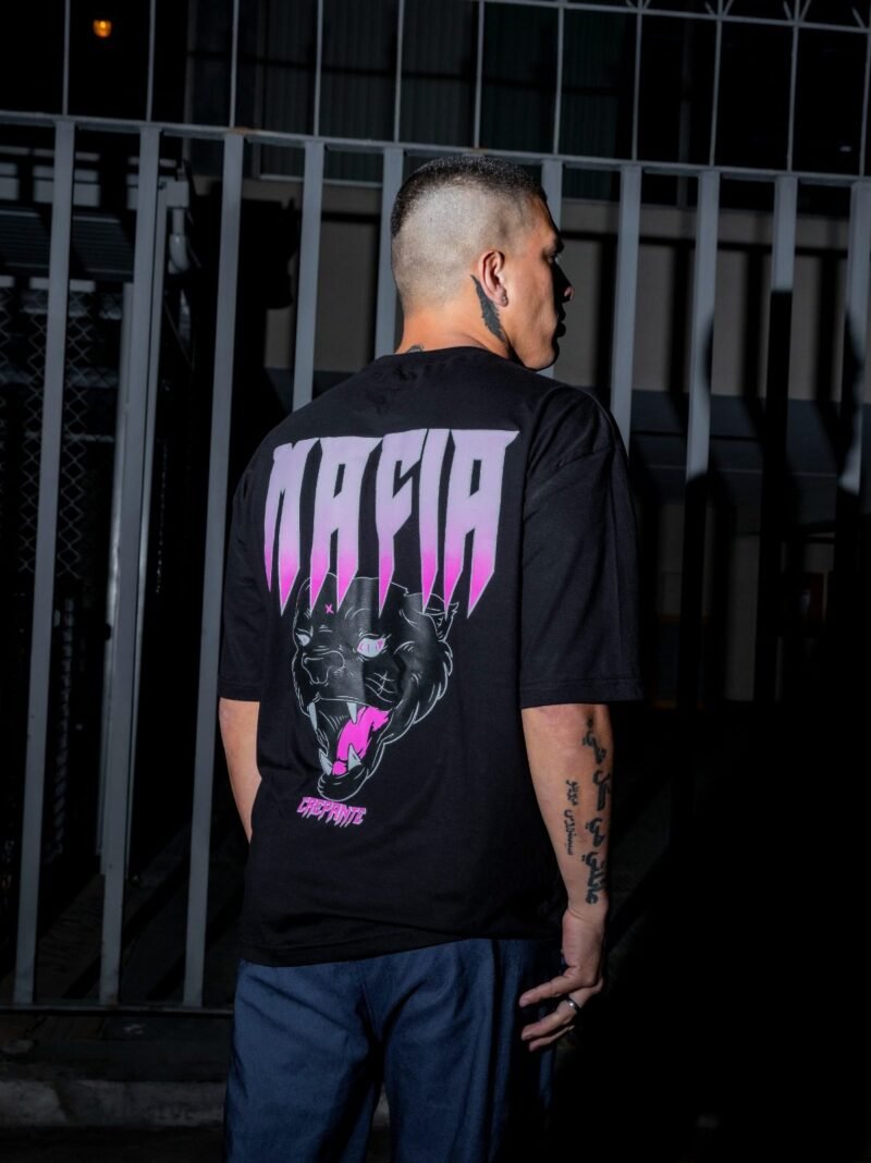El corazón de este polo reside en su impactante gráfico trasero. La palabra «MAFIA», estilizada con un degradado de rosa neón a blanco, captura todas las miradas, mientras que la pantera negra que emerge debajo simboliza todo lo que representa el hombre Ezzeta: sigilo, fuerza, inteligencia y una elegancia feroz. Este no es un estampado al azar; es un emblema. Representa a una hermandad, una «familia» unida por el estilo y la ambición.
