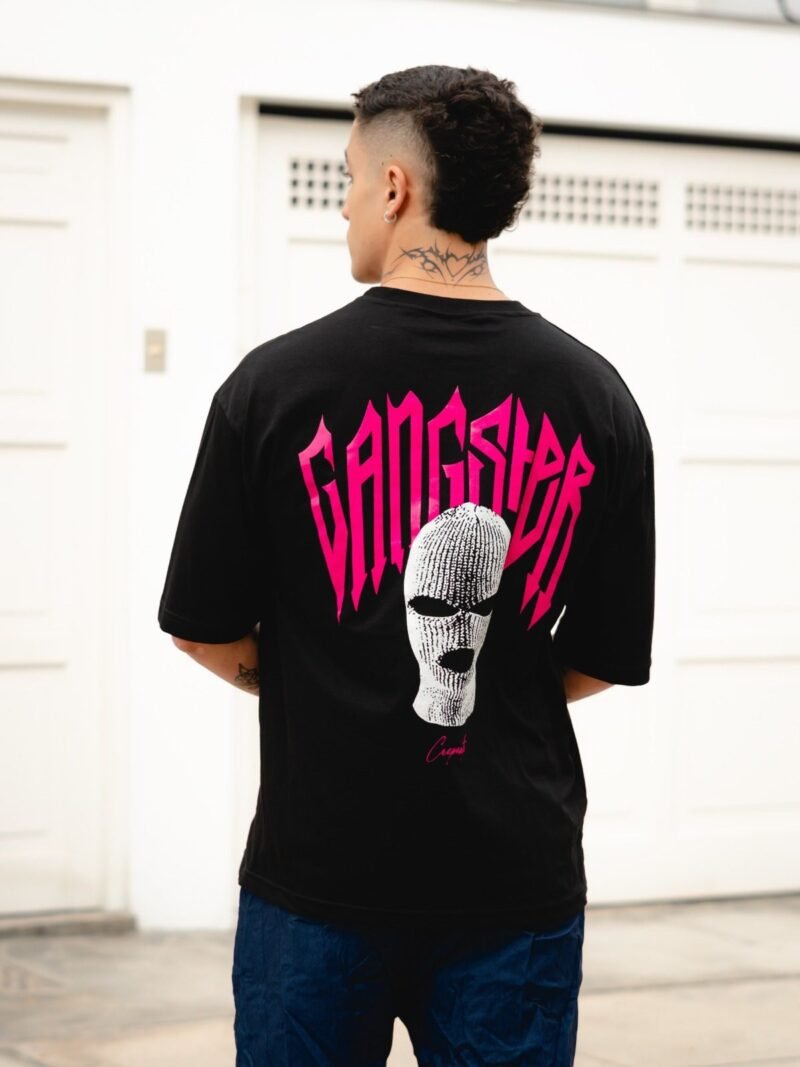 El poder de este polo negro oversize reside en su audaz dualidad. En la espalda, el diseño explota con la palabra «GANGSTER» en una tipografía agresiva y un rosa neón que desgarra la oscuridad. Debajo, el icónico pasamontañas, símbolo de misterio, anonimato y acción. Es un mensaje claro: tus acciones hablan más fuerte que tus palabras. Este impactante gráfico trasero asegura que dejes una impresión imborrable.