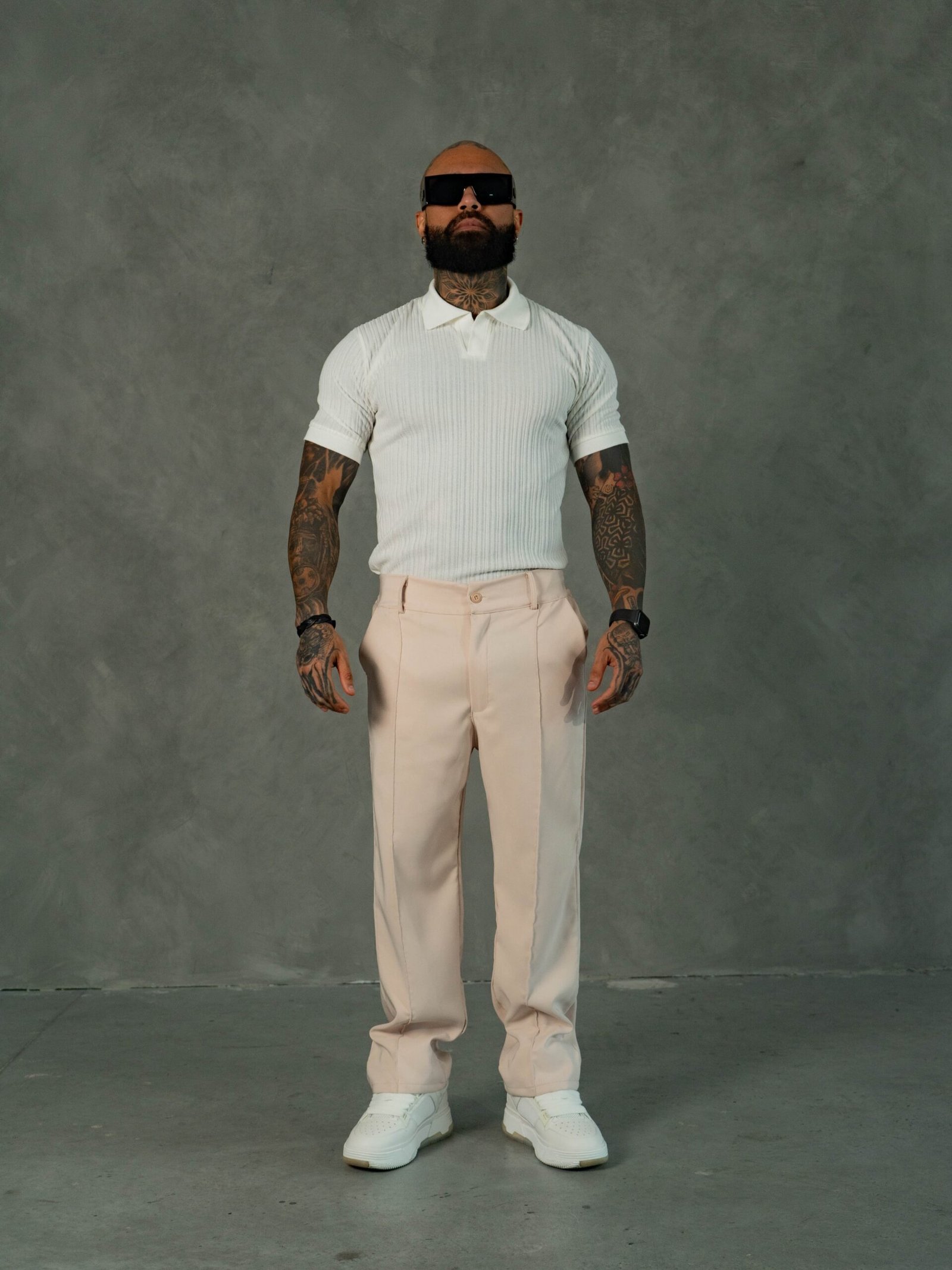 - Look Tonal y Sofisticado: Para una máxima expresión de elegancia, como se ve en las imágenes, combina tu Polo Perla Camisero Custom con pantalones de vestir o joggers en tonos claros como el beige, crudo o un rosa pálido. Este juego de tonalidades crea un look cohesivo, limpio y muy chic. Compleméntalo con zapatillas blancas minimalistas para mantener la paleta de colores pulcra y moderna.