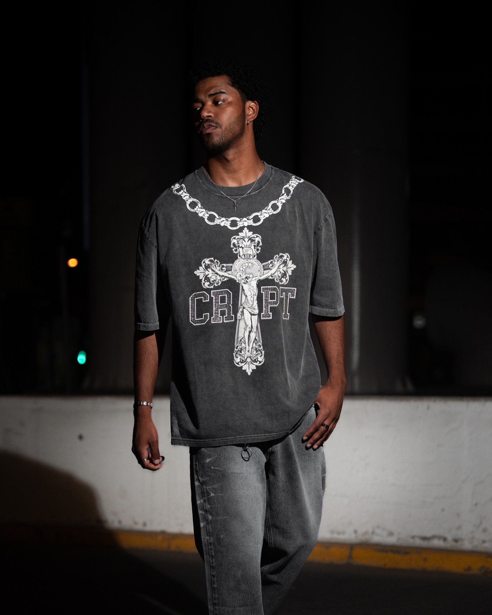 El diseño frontal es una obra maestra de composición: una cadena impresa alrededor del cuello que elimina la necesidad de accesorios adicionales, flanqueando una cruz central detallada con la inscripción «CRPT». Esta es la firma de una dirección creativa que no teme explorar los límites entre lo sagrado y lo profano.