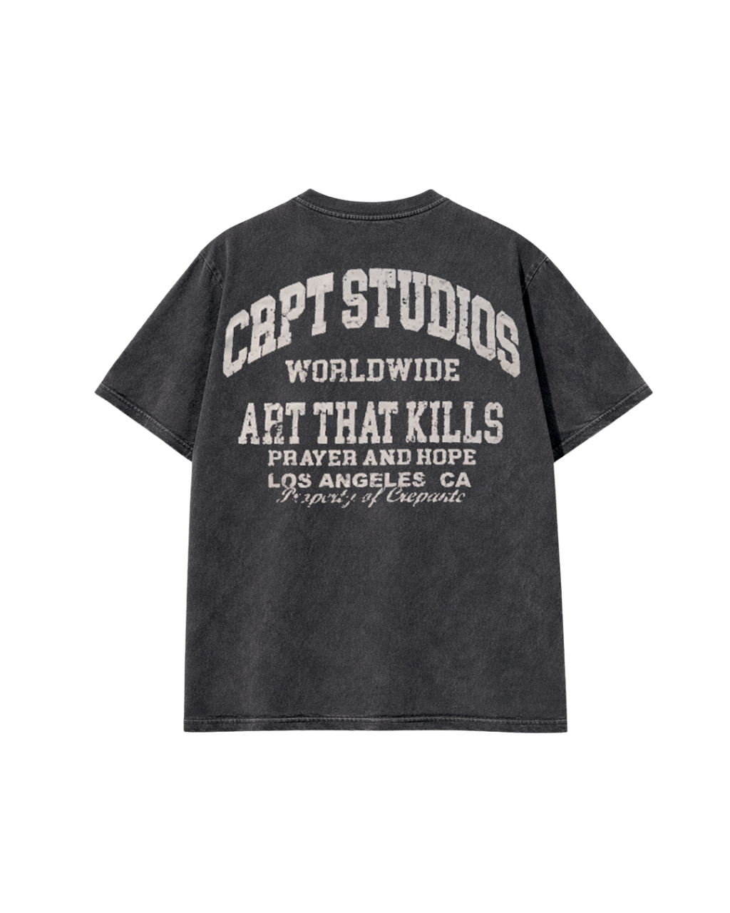 Con una base en tono plomo con efecto barrido (acid wash) que evoca el asfalto y la crudeza urbana, este diseño integra simbología clásica con la rebeldía moderna de CRPT Studios.