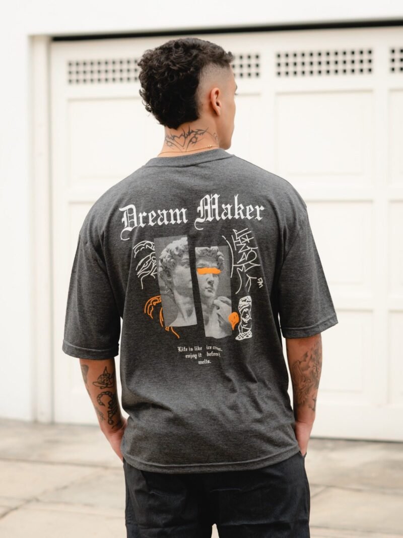 El corazón de este polo es su complejo y fascinante diseño trasero. Es una fusión de épocas y filosofías. En la parte superior, «Dream Maker» se erige en una tipografía gótica, declarando tu rol como creador. Debajo, una estatua clásica, símbolo de la perfección y el potencial atemporal, es deconstruida, fragmentada y reinventada con trazos de arte callejero y una censura naranja que te invita a cuestionar y reinterpretar el pasado.