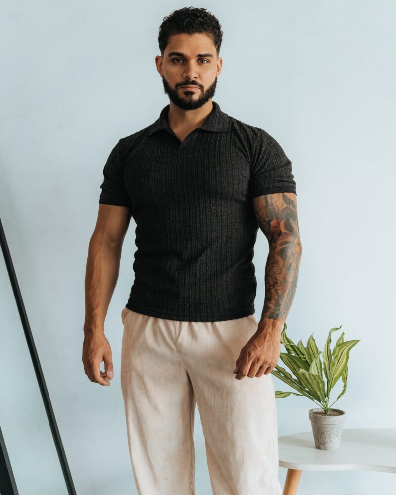 - Contraste Arquitectónico: La forma más nítida y moderna de llevar el Polo Plomo Rata Camisero Custom es contrastándolo con pantalones de colores claros. Unos pantalones o joggers en blanco, hueso o beige claro crearán un look de alto impacto visual, limpio y muy sofisticado, como se aprecia en las imágenes.