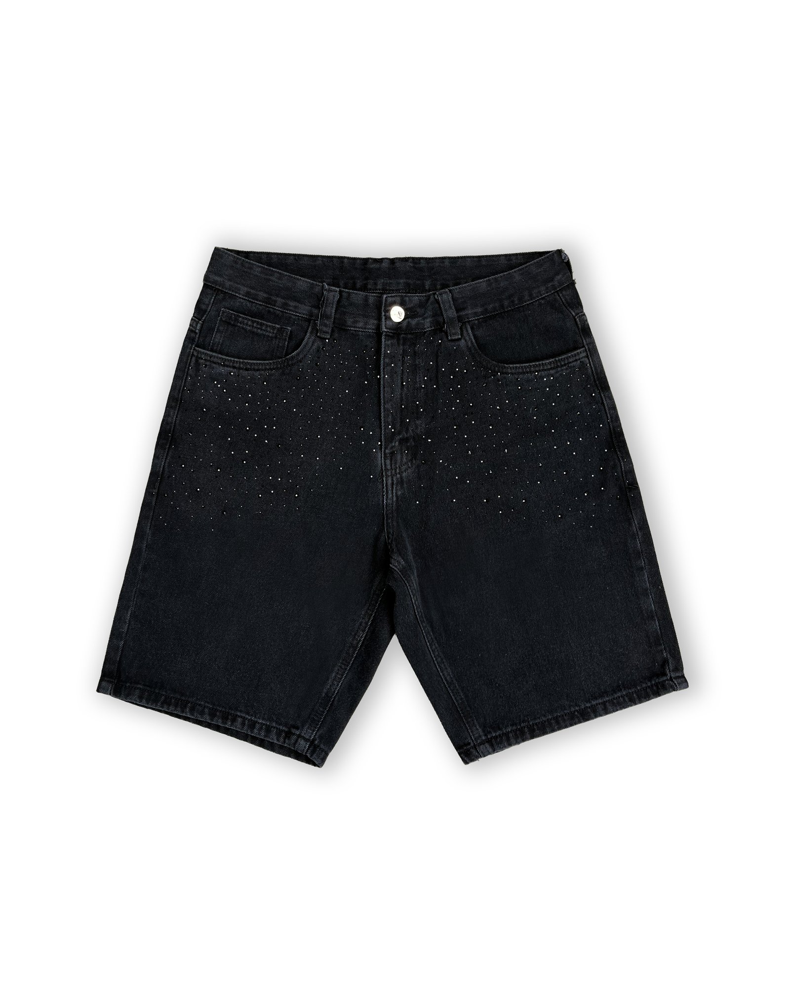 Short de corte recto, con ajuste relajado en caderas y muslos, que estiliza la figura y brinda máxima comodidad. Cuenta con dos bolsillos traseros, cuero impactante y botón personalizado de la marca. Presenta un lavado clásico en color entero negro, con piedras negras brillantes en la parte superior de las piernas, que le aportan un toque único y sutil.