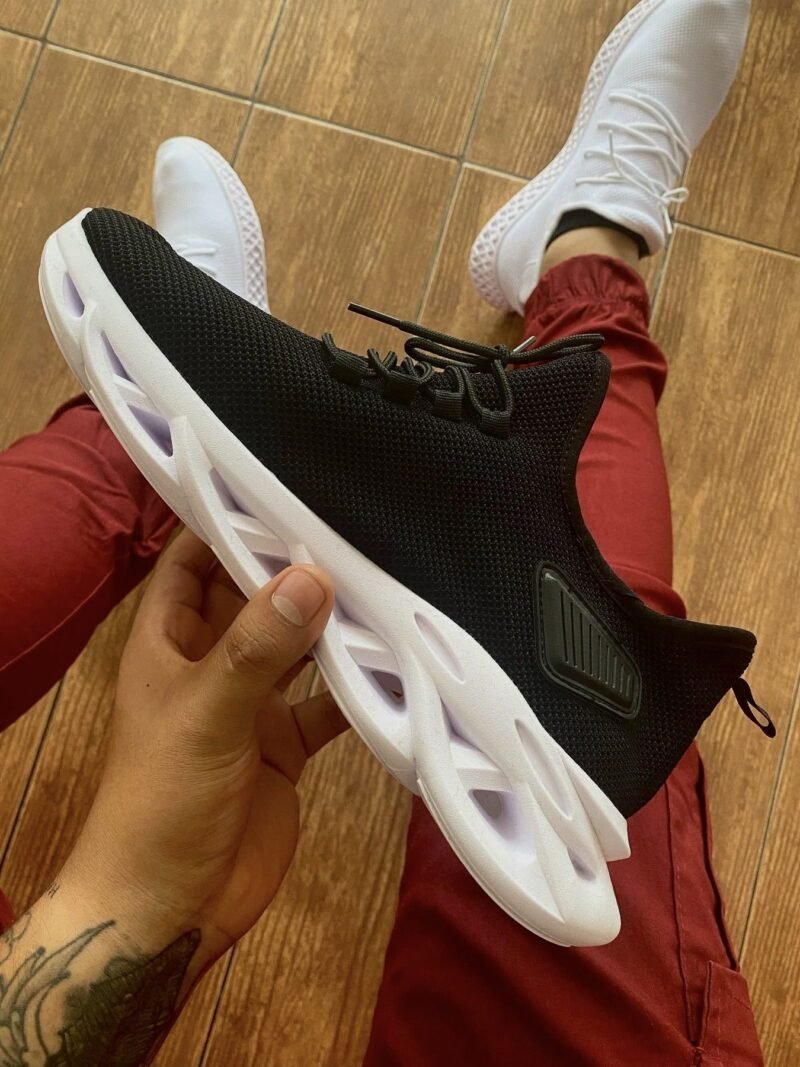 La estética de este modelo se centra en su suela esculpida con un patrón de burbujas entrelazadas que simulan un trenzado, no solo por su atractivo visual sino por su funcionalidad. Este diseño ergonómico de la suela proporciona una amortiguación superior y un retorno de energía optimizado con cada paso, haciendo que cada movimiento sea más eficiente. La capellada en un negro profundo complementa la suela, creando un contraste audaz que eleva cualquier outfit.